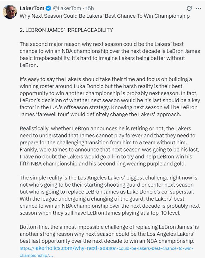 北京时间6月13日,湖人媒体Laker Tom记者汤姆-考德尔长文解析洛杉矶湖人队下赛季将是未来10年唯一的夺冠机会,他列举了四个理由,每一篇都是长篇大论,这里我就列出中心思想。